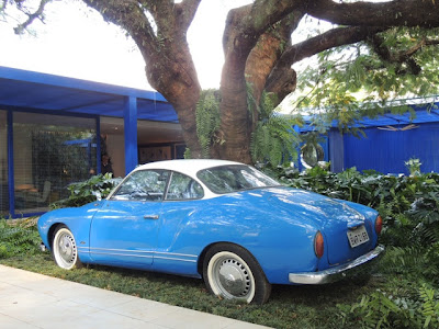 Da frente já se vê a varanda o jardim e o carro antigo estacionado.